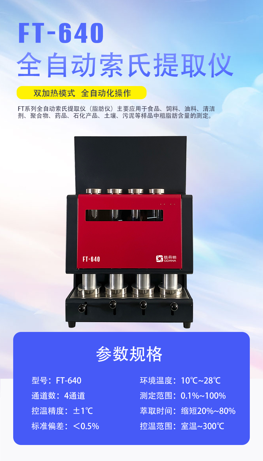 FT640索氏提取自動脂肪儀主要應用于食品、飼料、油料、清潔劑、聚合物、藥品、石化產品、土壤、污泥等樣品中粗脂肪含量的測定。