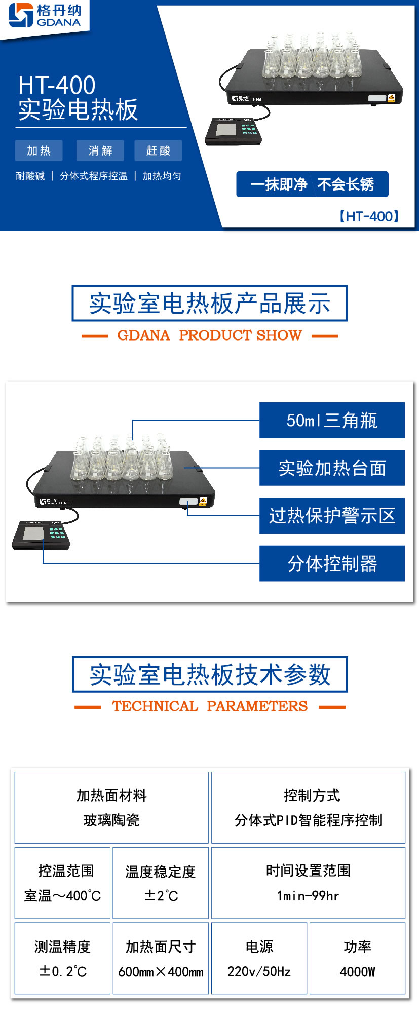 HT-400陶瓷加熱板專用于無機化學元素分析時對各類樣品作加熱、消煮、趕酸用的恒溫加熱裝置。臺面具有耐酸堿,不生銹等特性;分體PID程序數顯控溫,是實驗室樣品預處理好助手。
