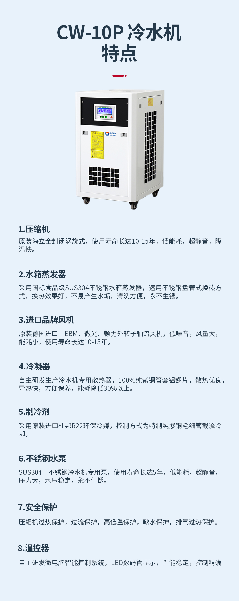 采用原裝進口杜邦R22環保冷媒,控制方式為特制純紫銅毛細管截流冷卻。