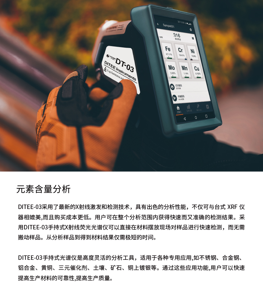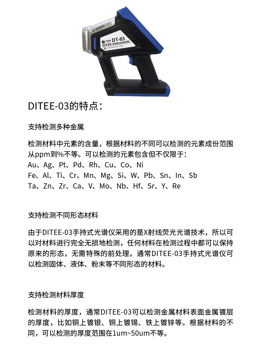 由于DITEE-03手持式光譜儀采用的是X射線熒光光譜技術(shù),所以可以對(duì)材料進(jìn)行完全無(wú)損地檢測(cè),任何材料在檢測(cè)過程中都可以保持原來的形態(tài),無(wú)需特殊的前處理。通常DITEE-03手持式光譜儀可以檢測(cè)固體、液體、粉末等不同形態(tài)的材料。