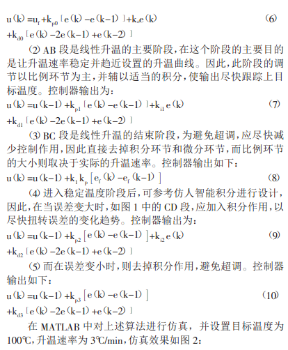 根據系統特性,設計控制規則如下: (1)在啟動階段,由于系統存在一定的時滯和較大的慣性,必須加以比較強的控制作用,才能使系統盡快響應因此應根 據本階梯的穩定溫度和升溫速率加入前饋控制量 ,控制器輸出為: