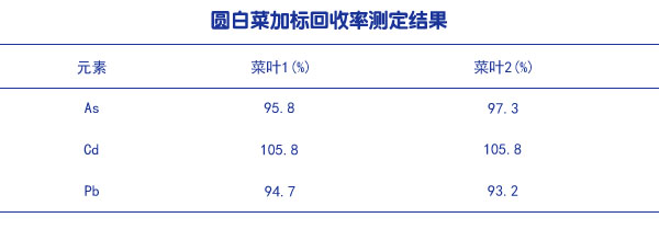 選取了2個未知含量的圓白菜樣品進行全流程加標回收試驗,測定結果見表(圓白菜加標回收率測定結果),加標回收率均在90%~11O%,基本滿足測試準確度要求,實驗室研究可以采用此方法。