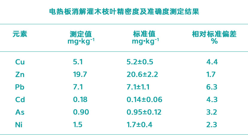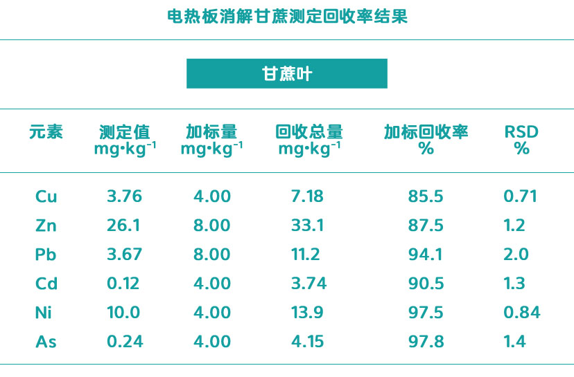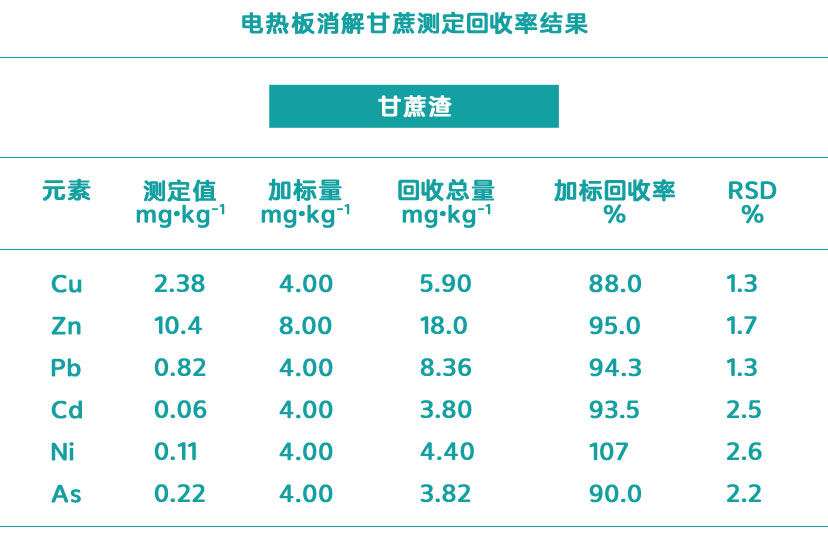 由表中得出,實驗測定值均在標準值范圍內(nèi),滿足實驗要求,電熱板消解方法適用于甘蔗、植物等的消解。